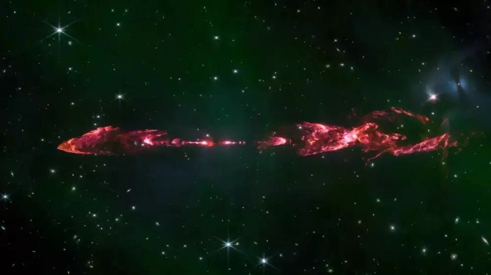Старший советник Европейского космического агентства Марк Маккогрин, рассказал, что неоновые вспышки, запечатленные на снимке, называются джетами или истечениями. Они являются моральным побочным продуктом рождения звезды, а их яркий оттенок указывает на присутствие молекулярного водорода.