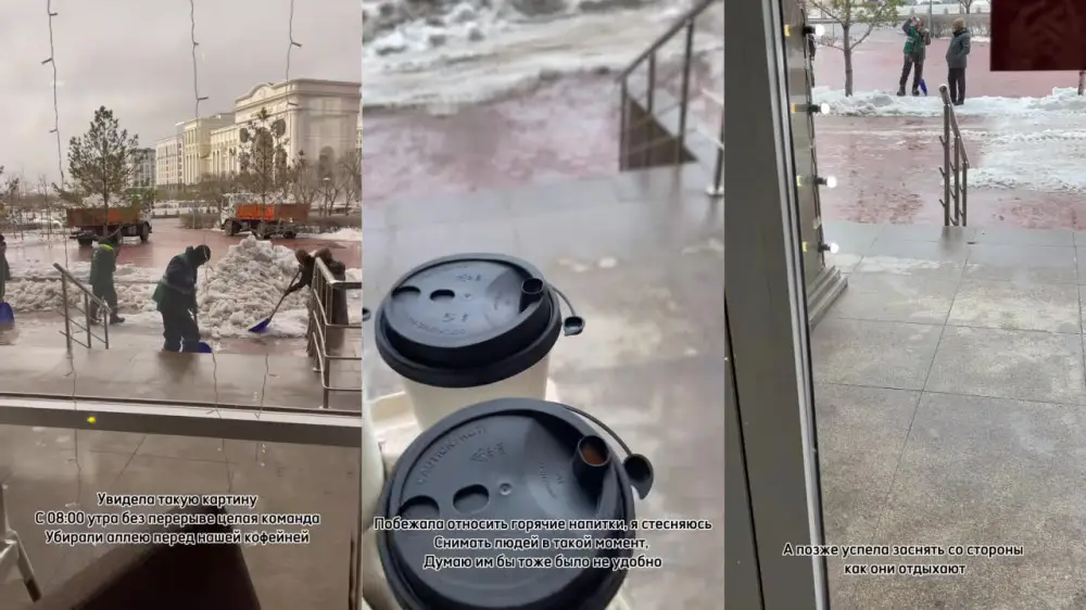 Видео, где девушка угостила чаем работников, которые убирали снег в одном из районов Астаны, стало виральным, собрав около 200 тысяч просмотров. Автор ролика, 25-летняя предпринимательница по имени Диана, поделилась своей историей с корреспондентом. Она рассказала, что заметила рабочих еще утром и весь день наблюдала за их работой через витражные окна своего заведения. Видя, что никто из рабочих не берет перерыв на обед, она почувствовала грусть и решила угостить их горячим чаем и кофе.