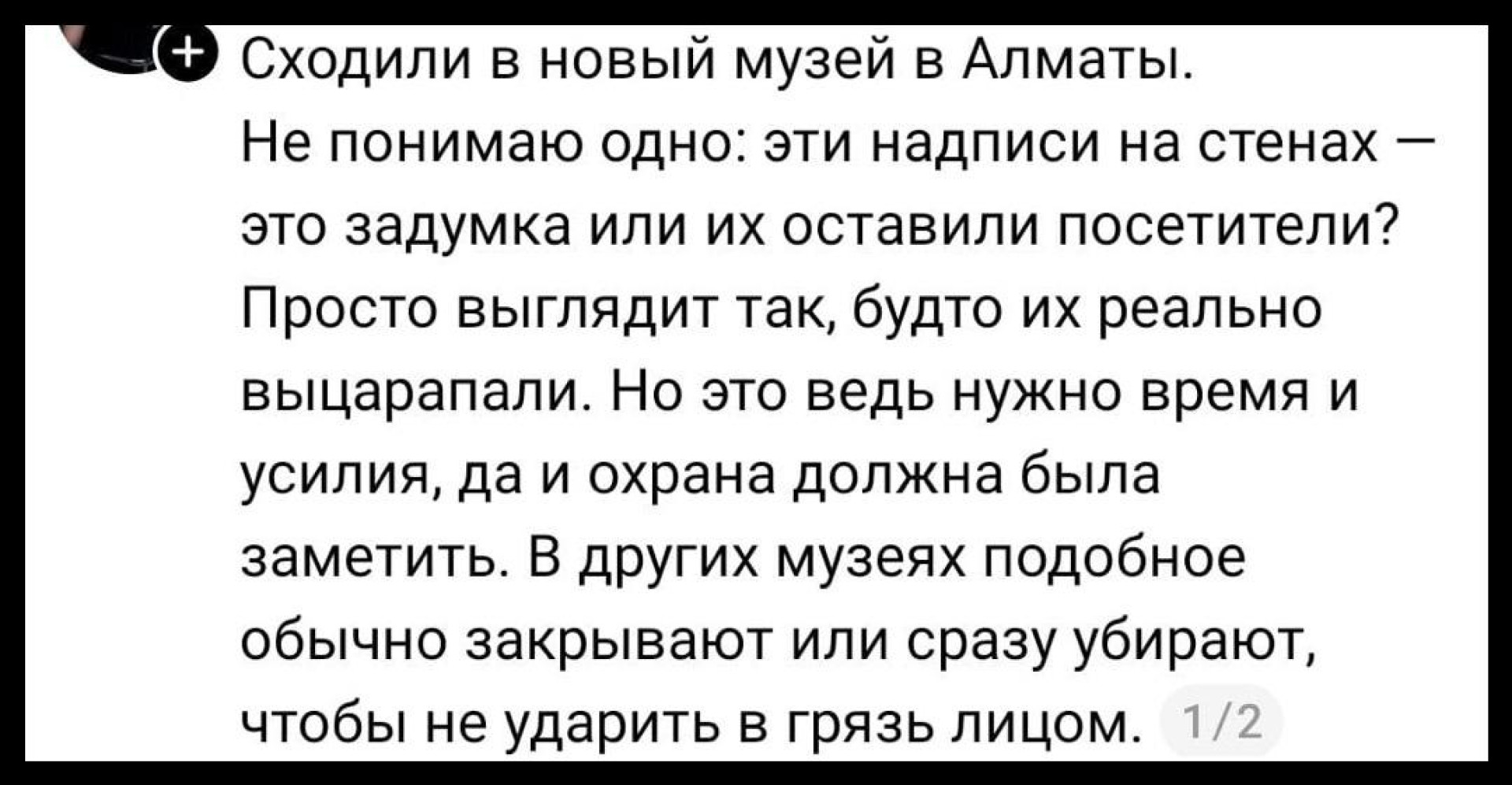 "Сходили в новый музей в Алматы. Не понимаю одного: эти надписи на стенах - это задумка или их оставили посетители? Просто выглядит так, будто их реально выцарапали. Но ведь это требует времени и усилий, да и охрана должна была заметить. В других музеях подобное обычно закрывают или сразу убирают, чтобы не ударить в грязь лицом", - отметил он.