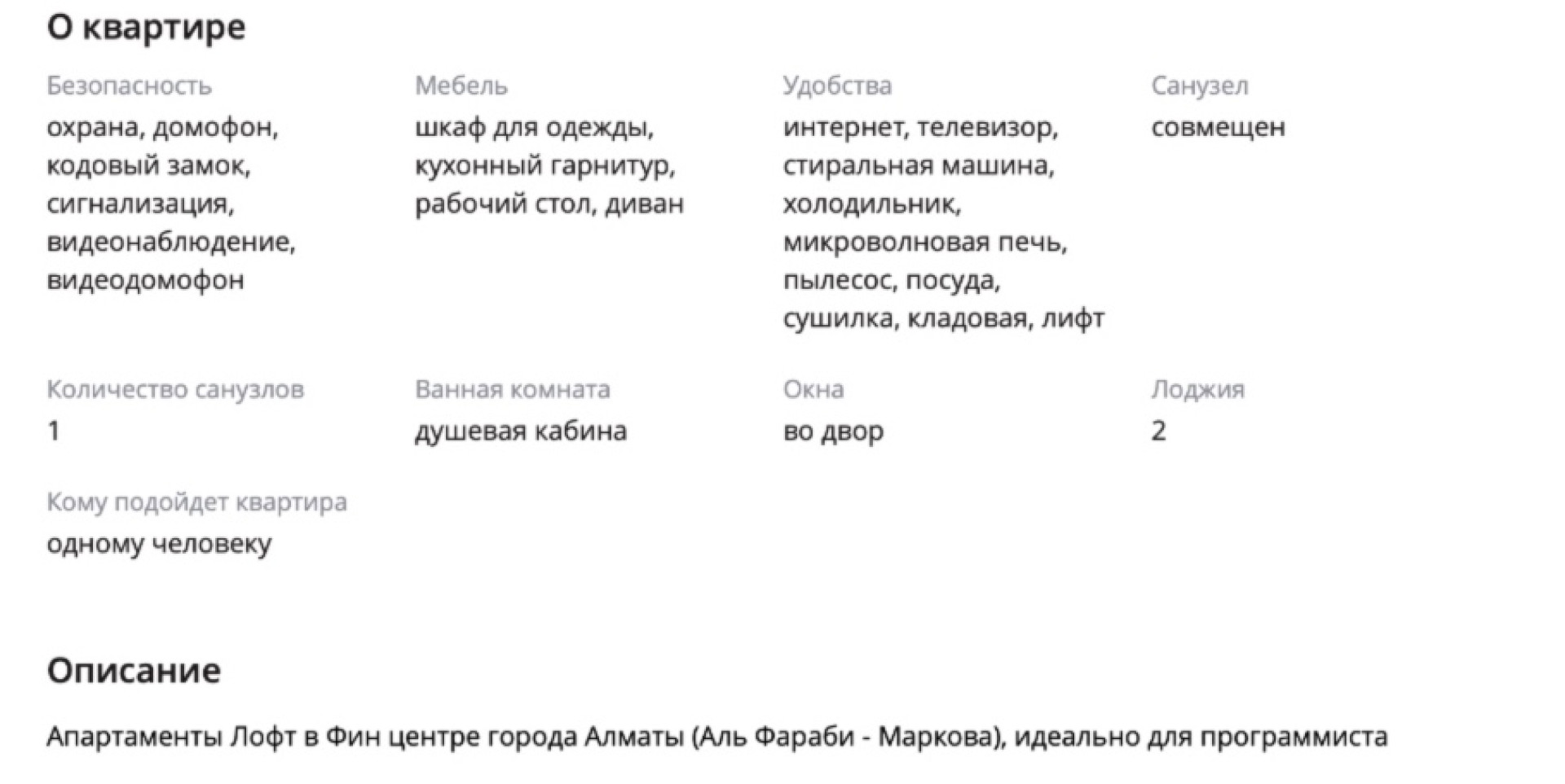 В объявлении уточняется, что речь идёт об однокомнатной квартире - "апартаментах в стиле лофт", расположенной в финансовом центре Алматы на пересечении проспекта Аль-Фараби и улицы Маркова. Отмечается, что это жильё станет отличным вариантом и "идеально подойдёт для программиста".