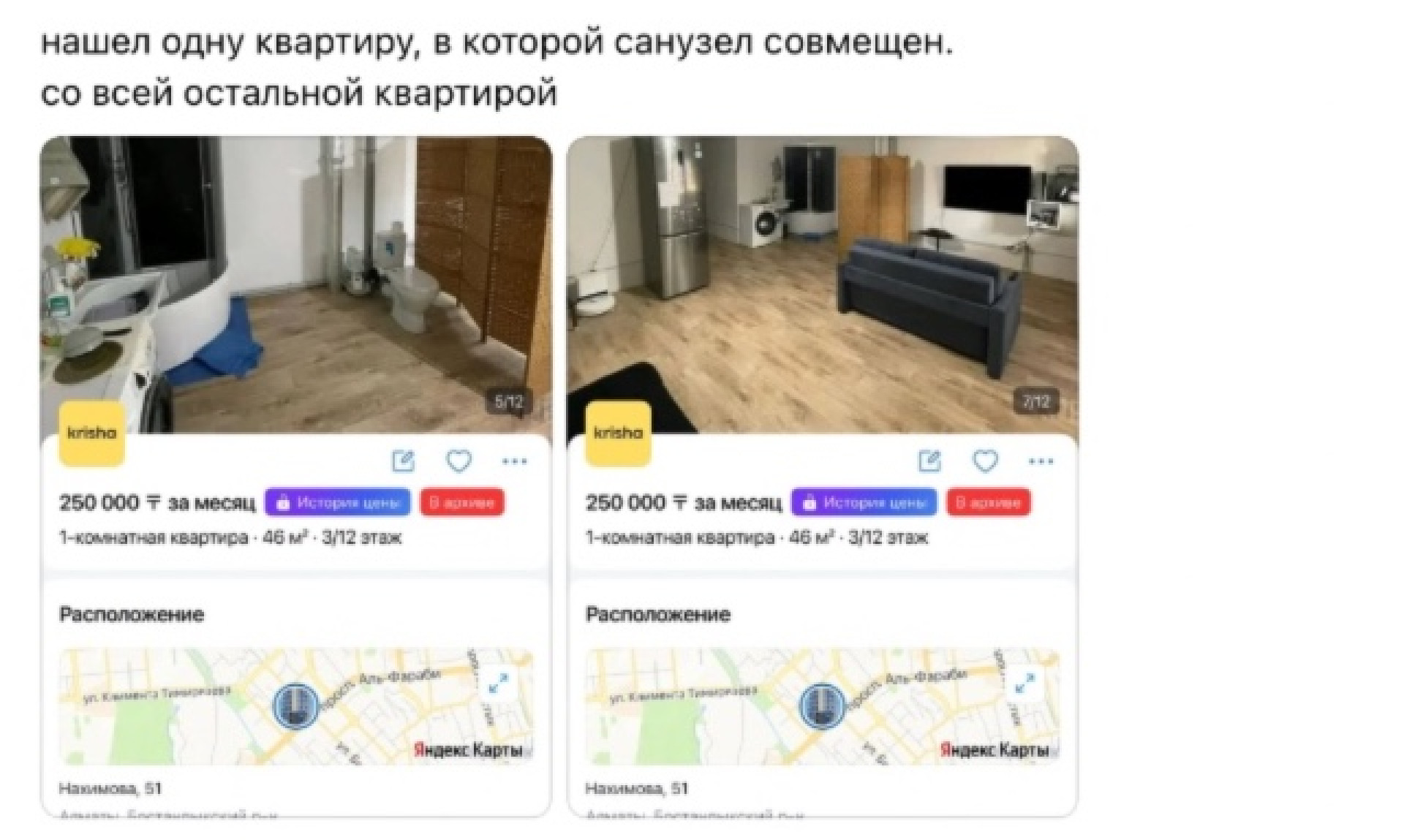 Так, в начале сентября в Казнете обсуждали объявление о сдаче жилья в Алматы. Арендодатель предлагал так называемую квартиру-комнату площадью всего 6 квадратных метров. На данный момент объявление уже недоступно. Подробнее об этом можно прочитать по ссылке.