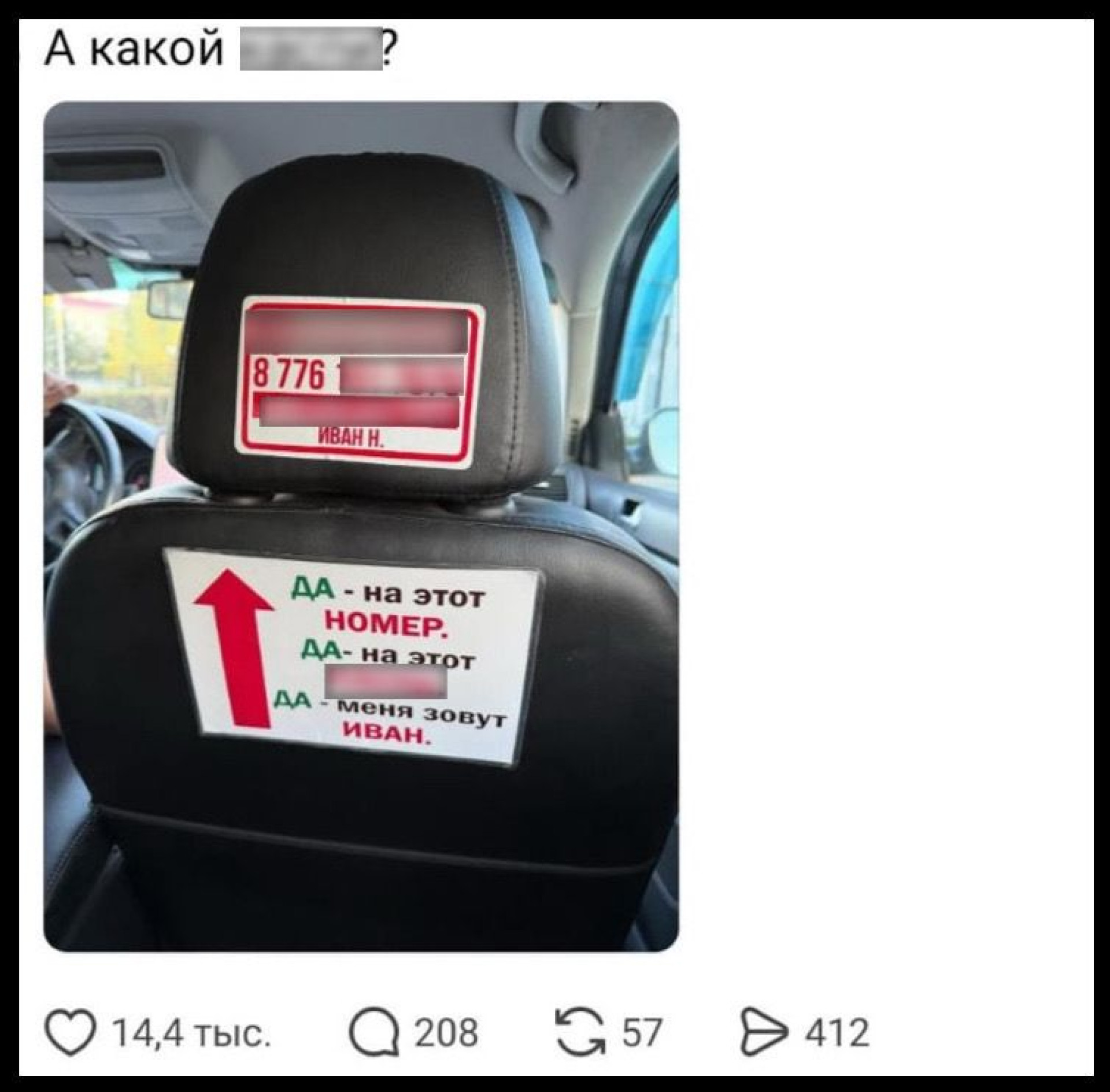 Один из пассажиров Ивана опубликовал в соцсети Threads фото, на котором видно объявление. На нём размещён текст: "Да - на этот номер. Да - на это приложение. Да - меня зовут Иван".