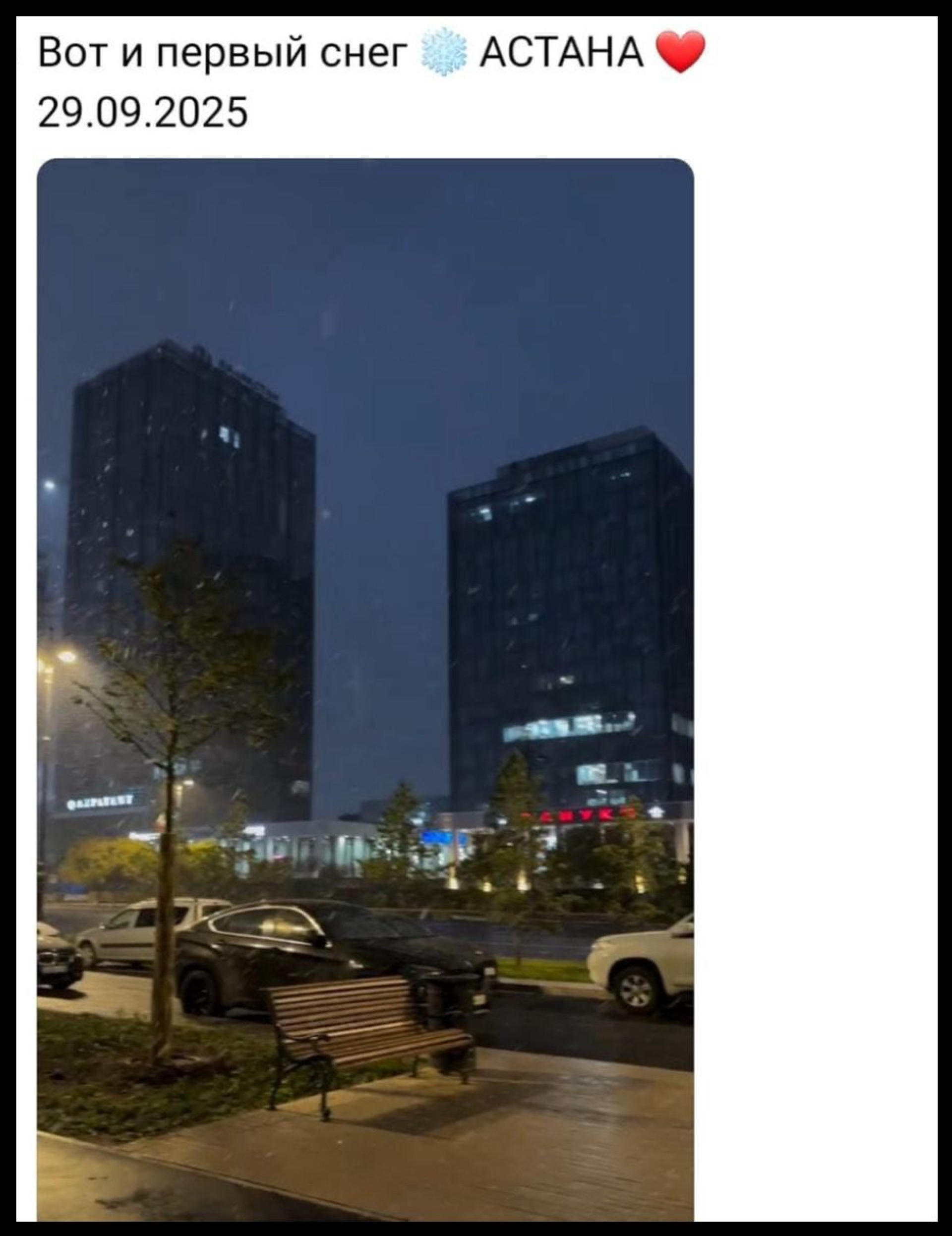 Жители Астаны и Костаная в социальных сетях активно делятся снимками и видео неожиданного снега. Некоторые пользователи соцсети шутят, что уже чувствуют новогоднюю атмосферу в сентябре. Собрали снежную подборку из Астаны и Костаная, подробнее рассказывает Tengri Life.