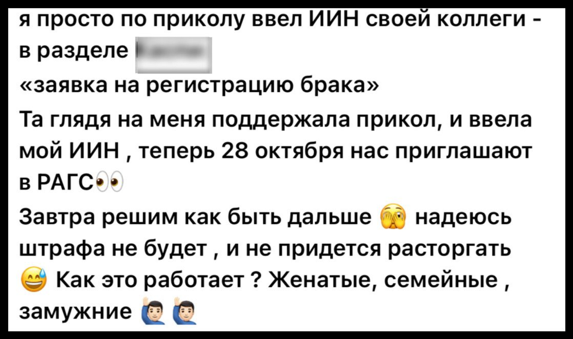 "Та, глядя на меня, поддержала прикол и ввела мой ИИН. Теперь 28 октября нас приглашают в РАГС. Завтра решим, как быть дальше. Надеюсь, штрафа не будет и не придется расторгать", — написал автор поста.