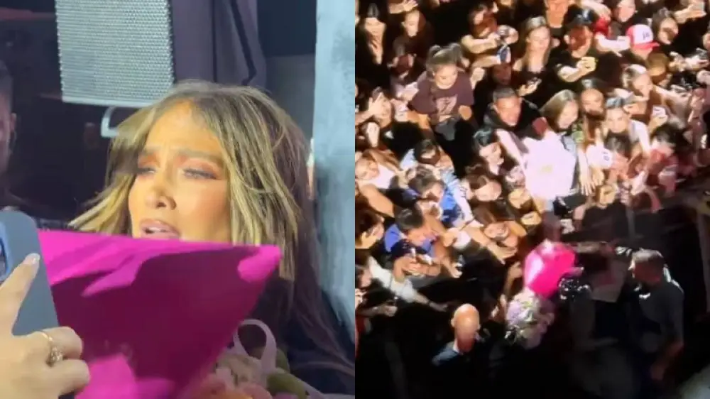 На одном из моментов шоу артистка спустилась со сцены к зрителям, чтобы поприветствовать их и сделать несколько селфи. В этот момент на неё сверху упал розовый предмет, который, судя по видео, сбил с Лопес кепку и, по всей видимости, напугал её.