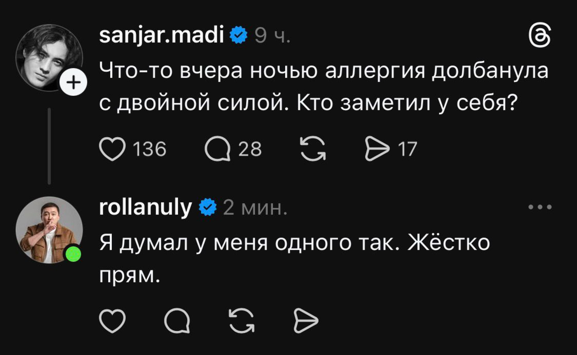 Актер Санжар Мади на своей странице написал: "Что-то вчера аллергия долбанула с двойной силой. Кто заметил у себя?"