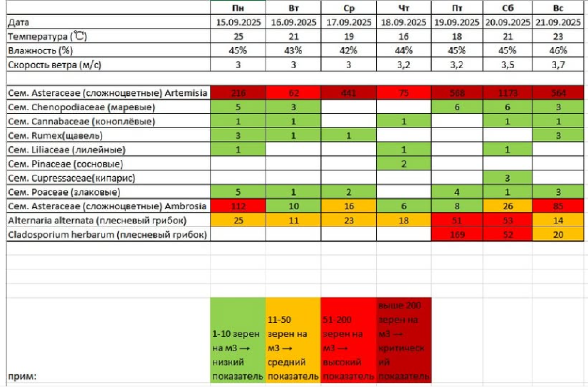 "На прошлой неделе пыльца полыни держалась на критически высоком уровне пять из семи дней, а в субботу показатель достиг рекордных значений — 1173 зерен на метр в кубе, что превысило все ранее фиксированные нами показатели сезона", — сообщил он.
