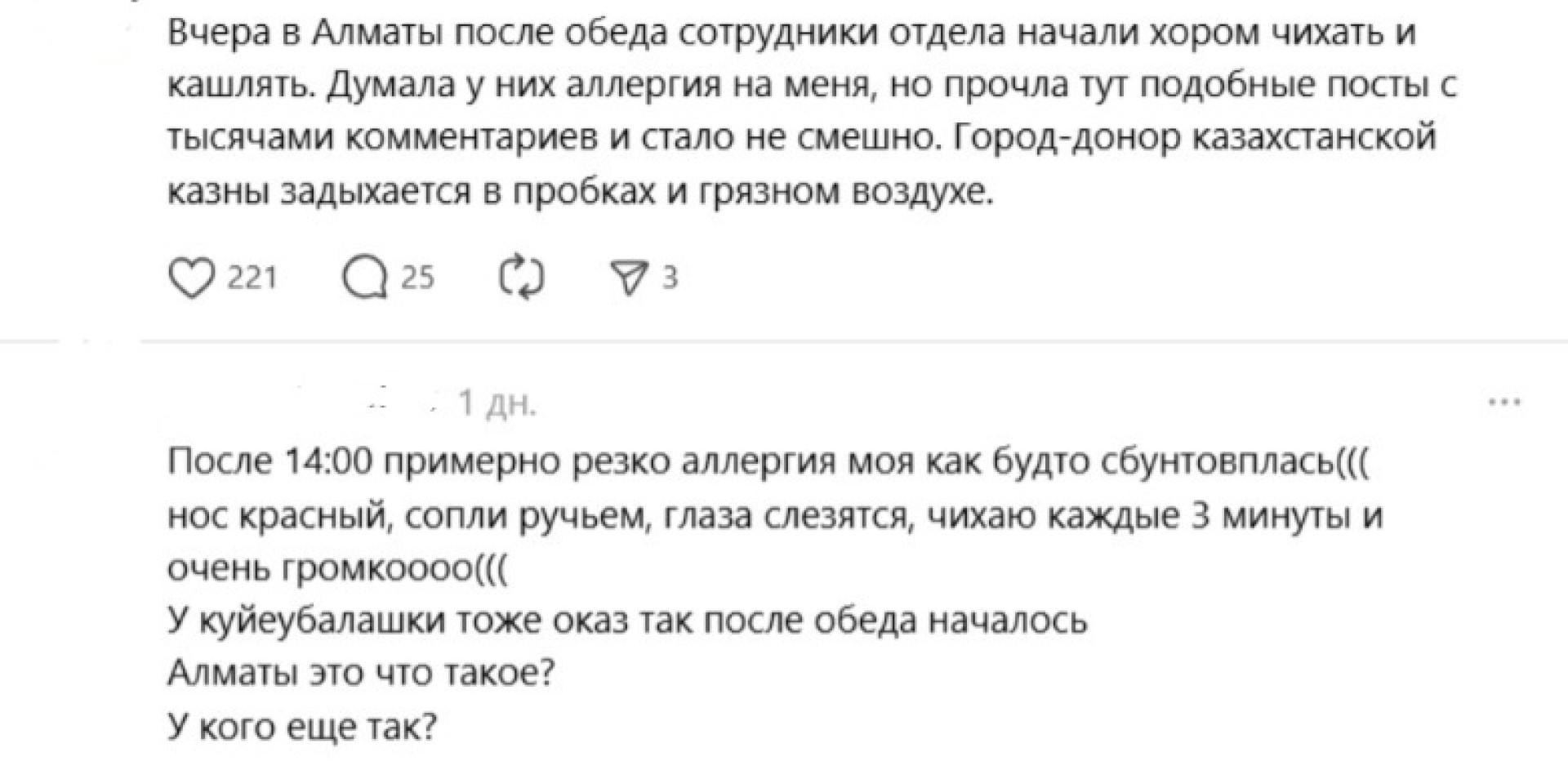 "После 14:00 резко аллергия моя как будто взбунтовалась. Нос красный, сопли ручьем, глаза слезятся, чихаю каждые 3 минуты и очень громко. У мужа тоже после обеда началось. Алматы, это что такое?" — рассказал один из пользователей сети.
