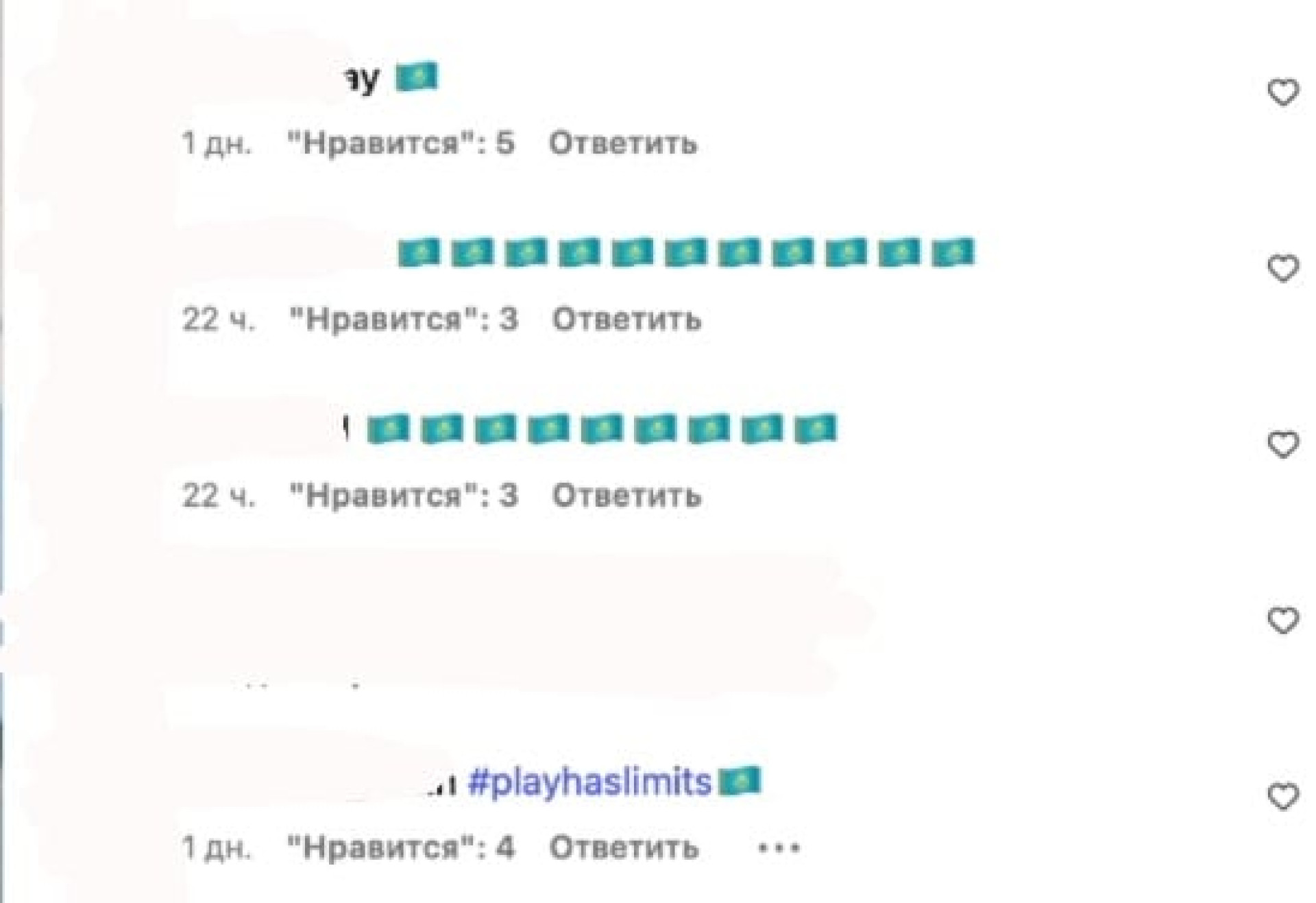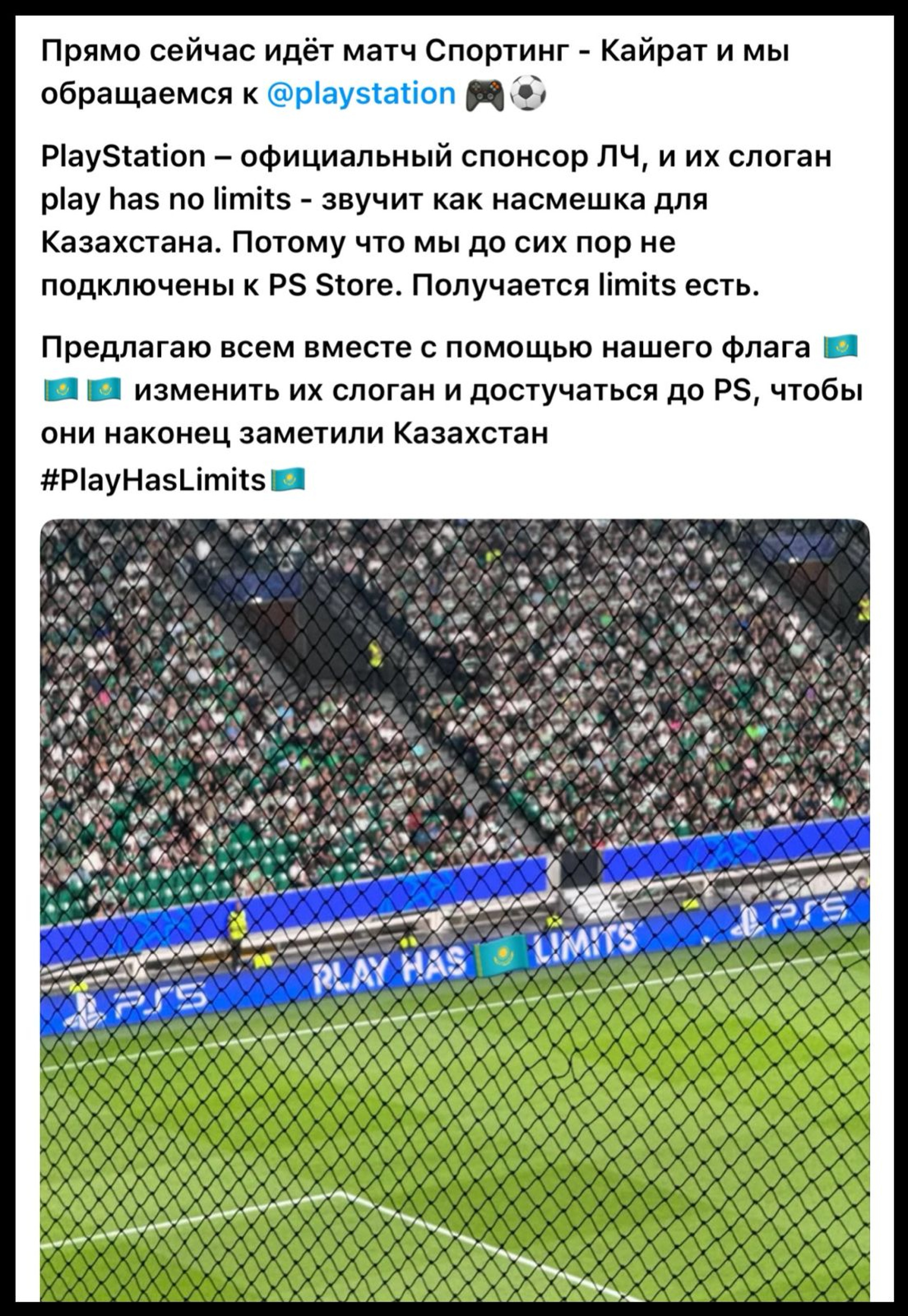 "Прямо сейчас идёт матч Спортинг – Кайрат, и мы обращаемся к @playstation. PlayStation - официальный спонсор ЛЧ, и их слоган play has no limits (игра без ограничений - перевод с англ.) звучит как насмешка для Казахстана. Ведь мы до сих пор не подключены к PS Store. Получается, limits (ограничения - перевод с англ.) всё-таки есть. Предлагаю всем вместе, с помощью нашего флага, изменить их слоган и достучаться до PlayStation, чтобы они наконец заметили Казахстан. #PlayHasLimits", - написала пользовательница соцсетей.