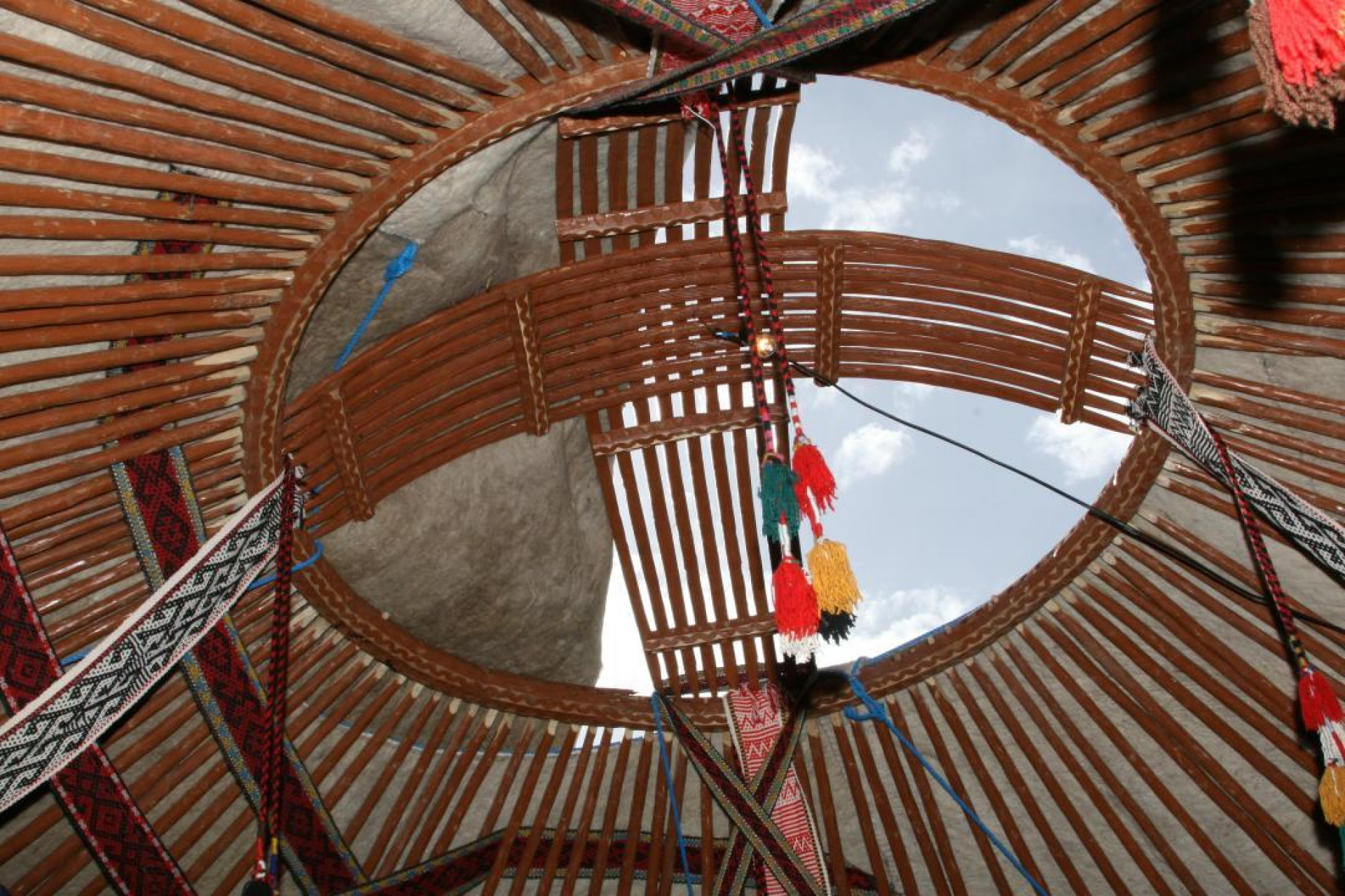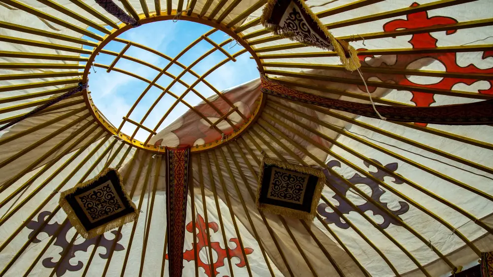 Шанырак — это круглая деревянная конструкция в верхней части юрты, которая соединяет уыки и завершает каркас жилища. С практической точки зрения он выполняет сразу несколько функций: служит окном в потолке, пропускает свет и выводит дым.