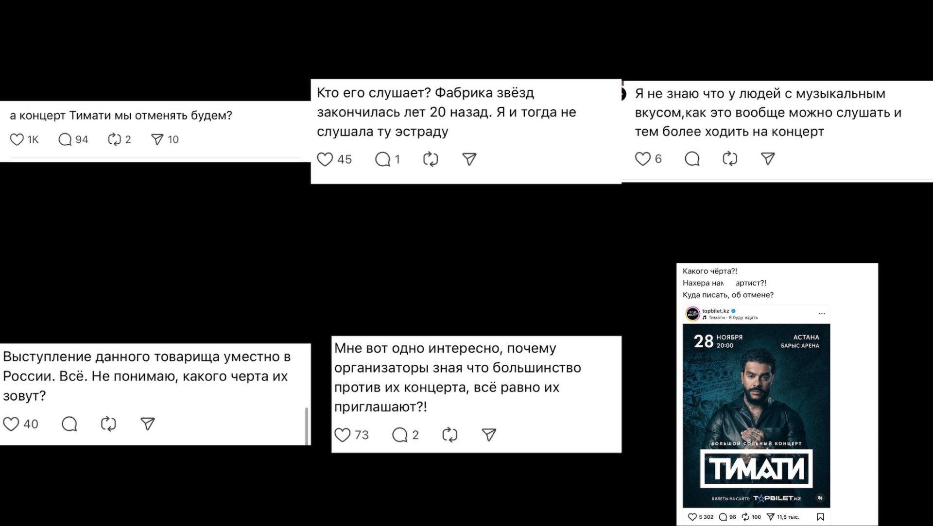 Казахстанцы продолжают активно обсуждать концерты зарубежных артистов. В социальных сетях то и дело возникают споры: сначала вокруг Алексея Чумакова, затем — Полины Гагариной, теперь — Тимати. Пользователи пишут посты, призывают не покупать билеты и задаются вопросом, могут ли власти запретить выступления тех, кто вызывает общественное недовольство.