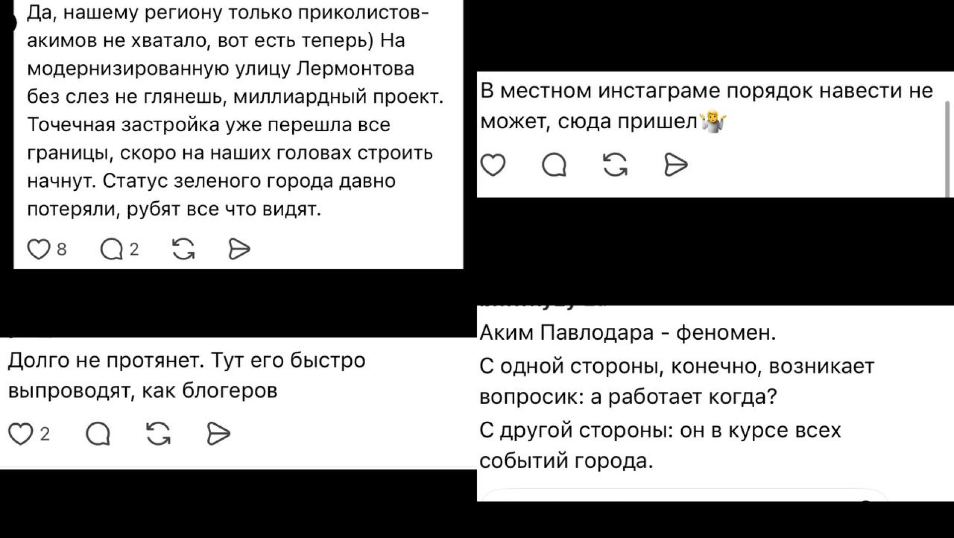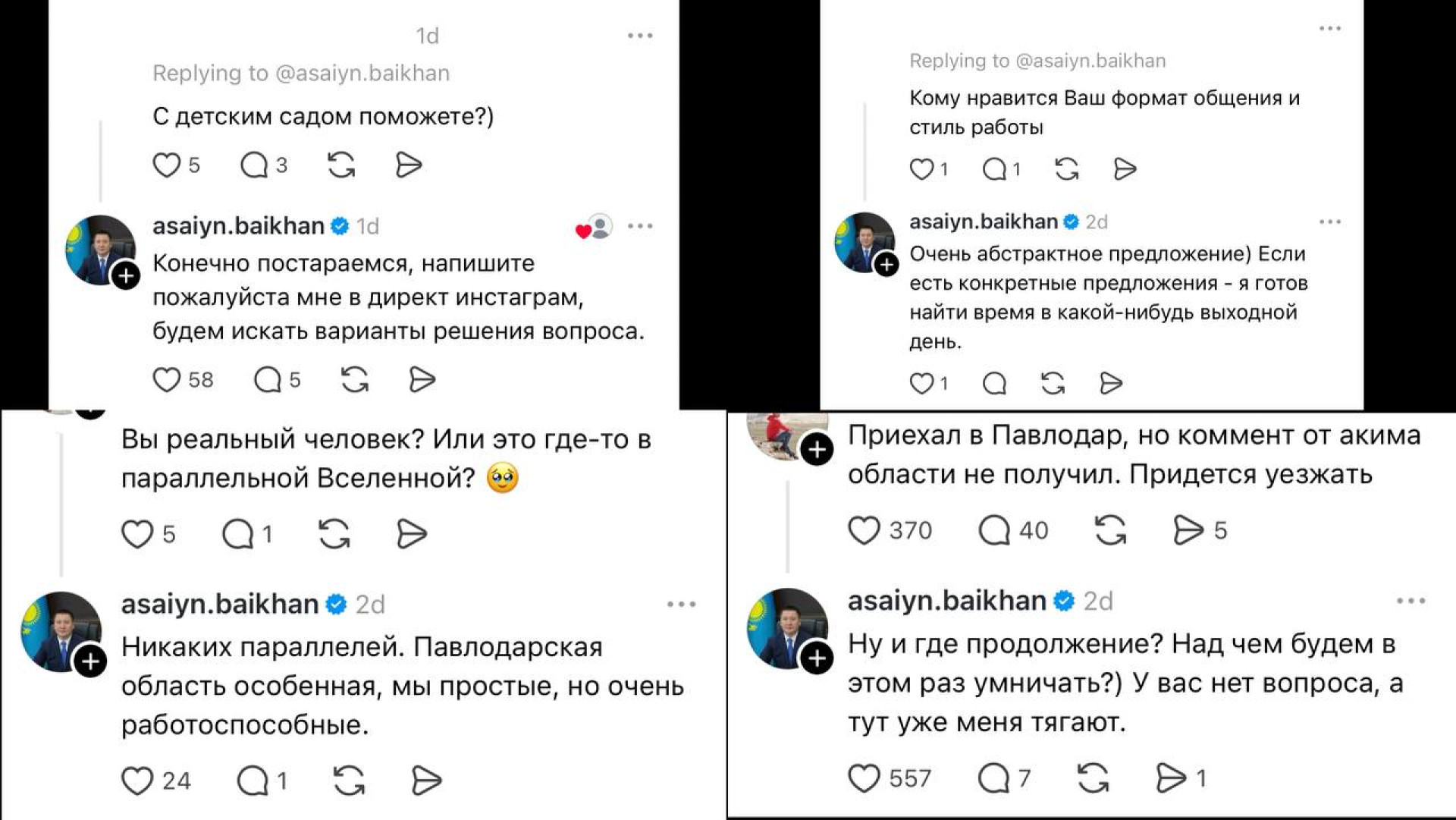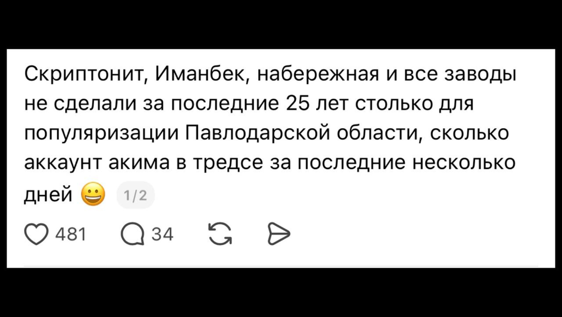 "Теперь Threads не казахстанский, а павлодарский", "Мне срочно нужны контакты его пиар-команды", "Аким сделал для популяризации Павлодара больше, чем Скриптонит и Иманбек", "Скриптонит, подвинься. У нас теперь есть аким", — шутят комментаторы.