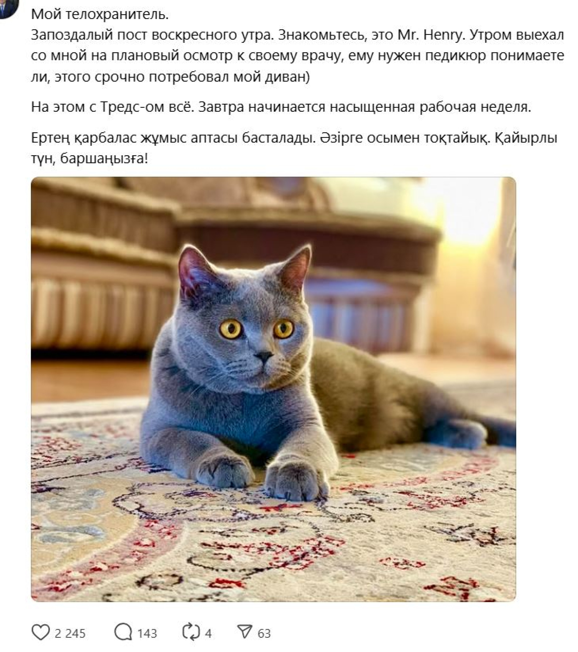 Одной из недавних публикаций, вызвавших интерес пользователей сети, стал пост акима о его коте по имени Mr. Henry.