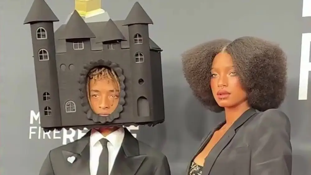 Джейден прибыл на красную дорожку в полностью черном костюме строгого кроя, который дополнил кроссовками с белыми вставками и черным галстуком. Однако основное внимание привлек его головной убор – массивная черная конструкция в форме замка, которая полностью покрывала его голову.