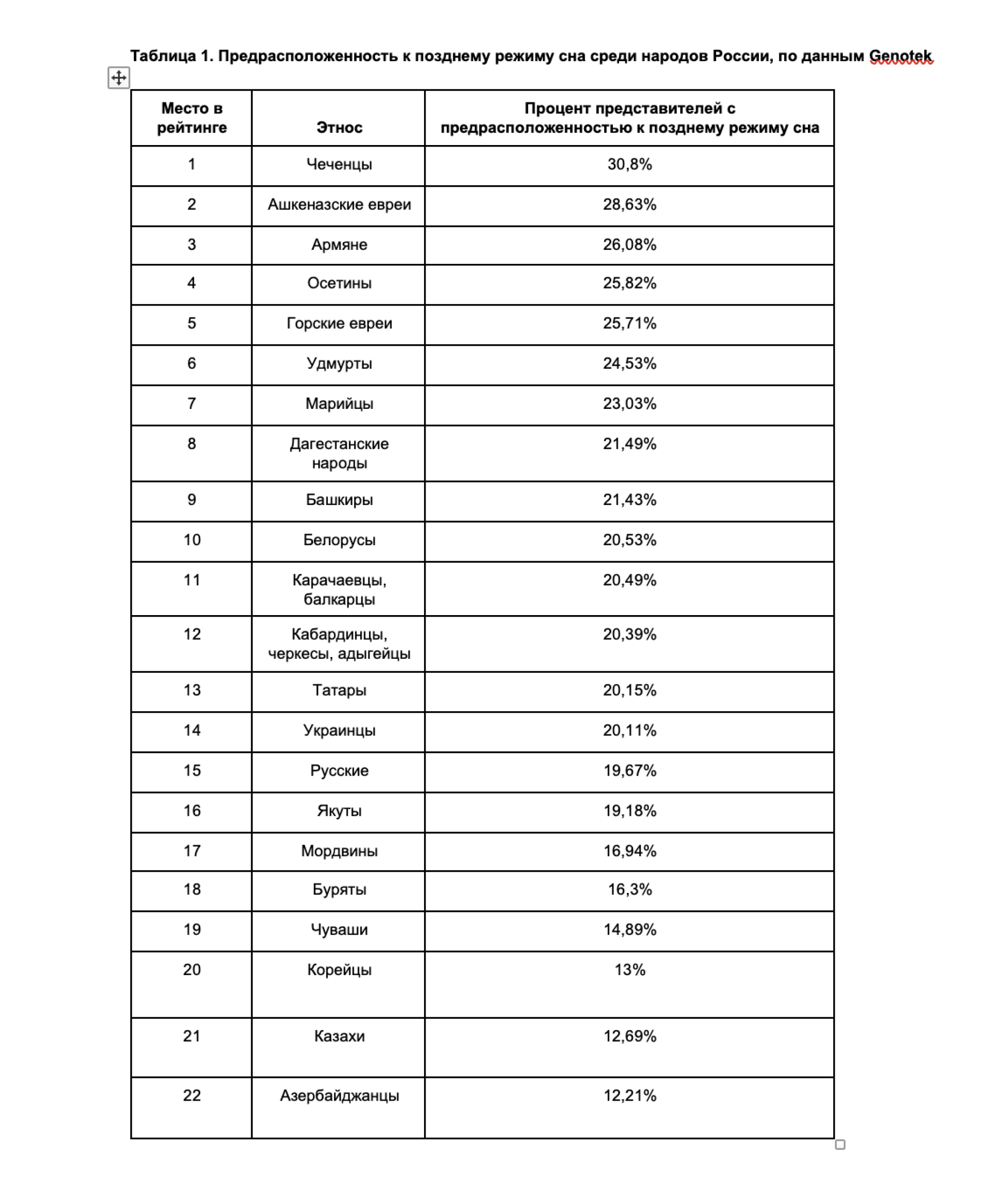 В результате было выявлено, что среди чеченцев (30,8%) чаще встречаются люди, предрасположенные к позднему режиму сна, на втором месте – ашкеназские евреи (28,63%), а на третьем – армяне (26,08%).