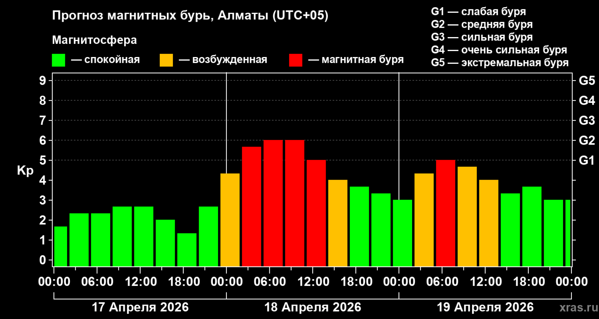 Согласно мониторингу, в Алматы вероятность магнитной бури достигает примерно 90 процентов в первый день и 70 процентов — во второй.