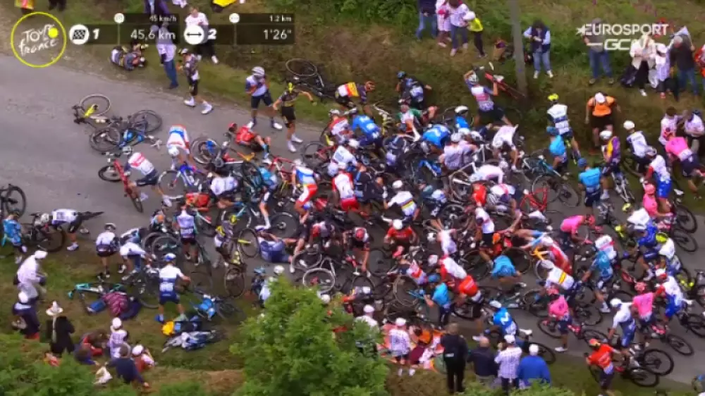 Зрительница стояла на правой стороне узкой дороги с большим картонным самодельным плакатом "Привет, дедушка и бабушка!", однако смотрела не на пелотон, а на проехавший мотоцикл с оператором. Большой плакат зацепил ехавшего с правого края в голове пелотона Тони Мартина, который упал под колеса ехавших плотной группой других гонщиков. За ним начали падать и другие велосипедисты. В результате в завале на первом этапе многодневки пострадал 21 гонщик.