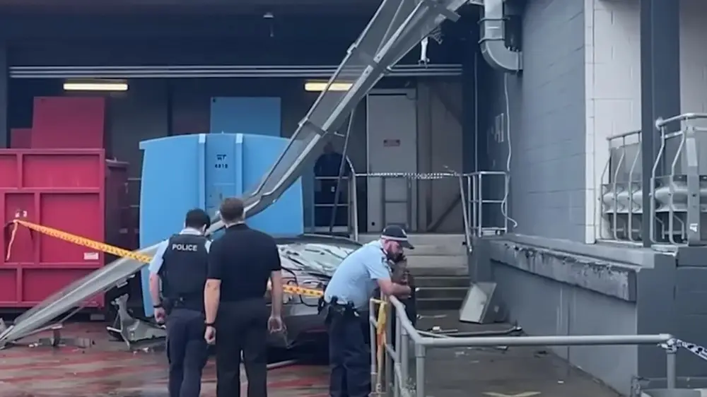 Tesla Model S с двумя пассажирами внутри пробила барьер на крыше парковки и упала на погрузочную площадку. Инцидент произошел в субботу на территории торгового центра DFO в районе Хоумбуш.