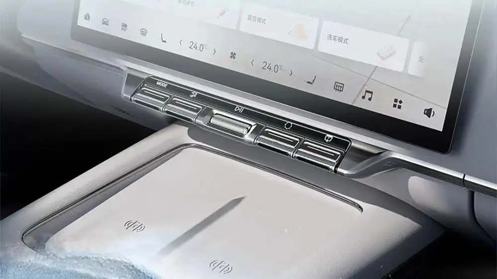 В отличие от седана 007, в 7X добавлены физические клавиши под центральным дисплеем для управления медиасистемой и климатической установкой. На тизерах также заметны два отсека для беспроводной зарядки смартфонов, динамик, вероятно расположенный на торпедо, и обивка кресла с перфорацией.