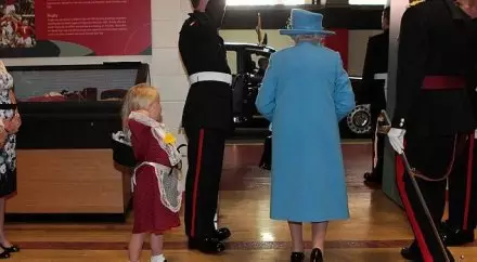 Елизавета II буквально на секунду остановилась, чтобы принять цветы и восхититься национальным уэльским нарядом девочки. Как только королева направилась к выходу, стоявший в карауле военный взметнул руку в салюте. Солдат, не заметивший девочку, нечаянно ударил ее по голове, сбив шляпку малышки.