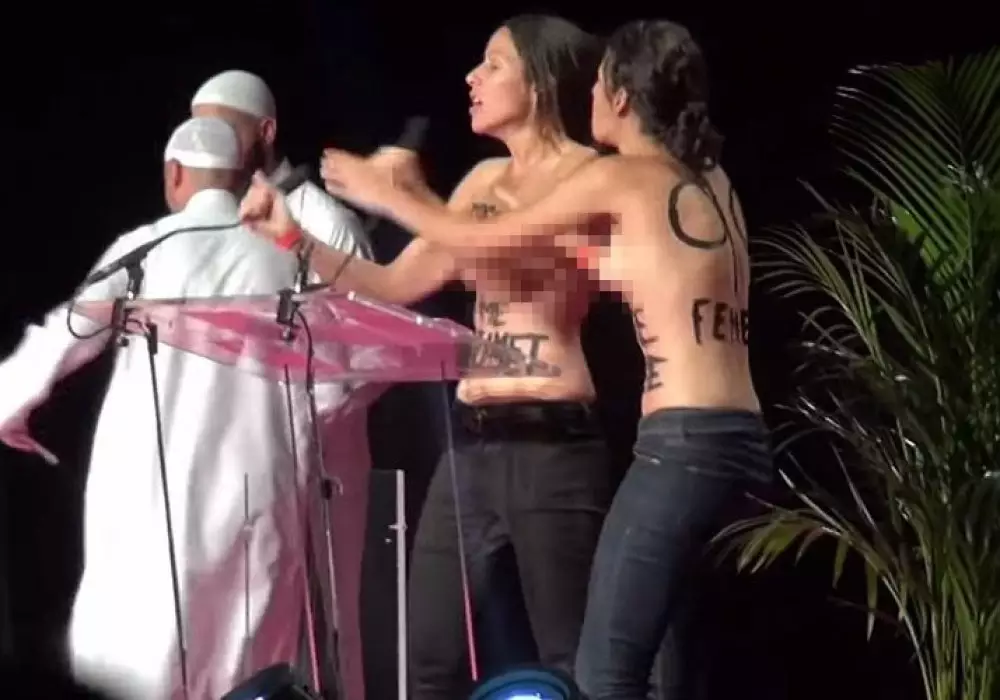 Две девушки залезли на сцену и сбросили с себя одежду во время лекции мусульманского проповедника Надера Абу Анаса о праве бить своих жен. Полуголые активистки сумели завладеть микрофоном и начали выкрикивать лозунги на французском и арабском языках.