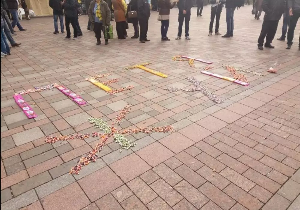 Издание сообщает, что протестующие выложили из нескольких килограммов сладостей надпись размером примерно один квадратный метр. Композицию хорошо видно из окон Верховной рады. Время от времени к надписи подходят прохожие, не принимающие участие в акции протеста, и едят конфеты.
