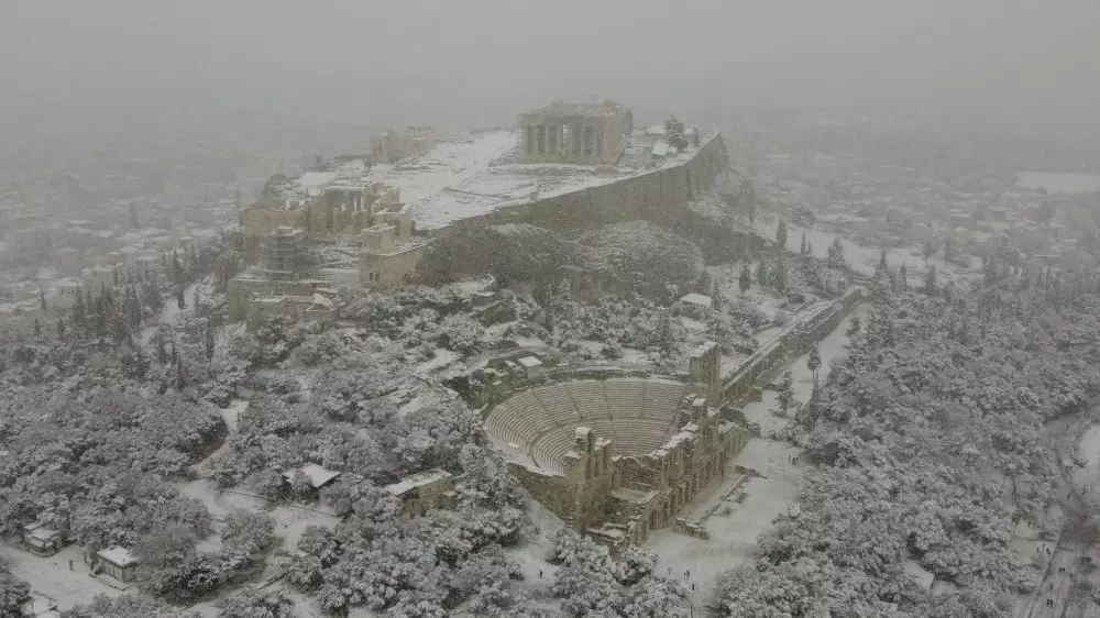 На Грецию обрушился снежный шторм "Эльпис", из-за чего снегом замело почти всю область Аттика, где расположена столица, а также курортные острова Миконос, Санторини, Сирос, Наксос, Тинос, Андрос и другие.