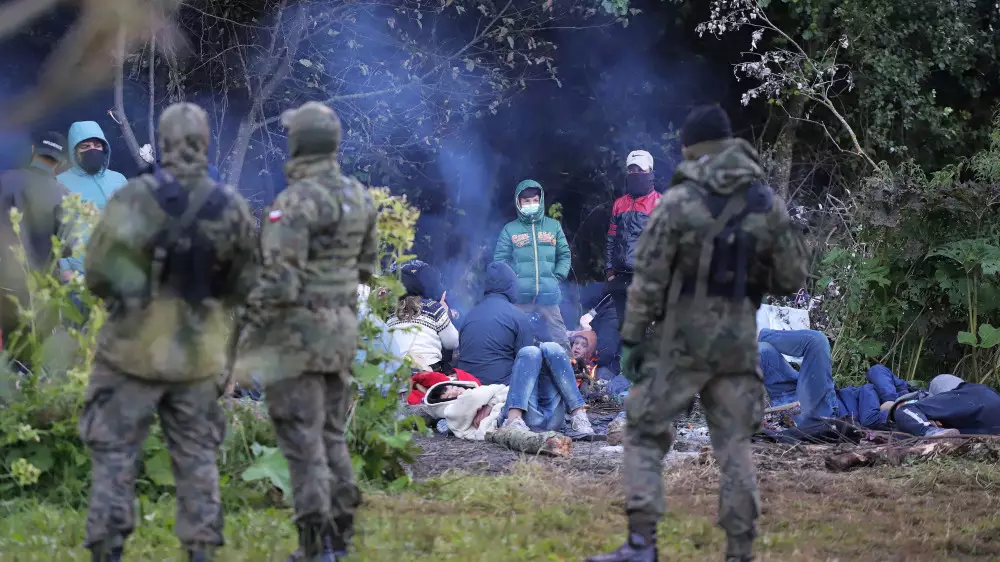 Десятки мигрантов разбили лагерь прямо на границе с Беларусью между линиями белорусских и польских военнослужащих возле польского села Уснаж Горный.