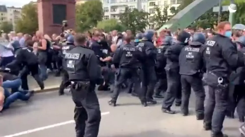 Полиция Берлина сообщила ранее в соцсети Twitter, что в выходные в центре города было запрещено проведение ряда уличных акций, порядок в городе обеспечивают около двух тысяч полицейских.