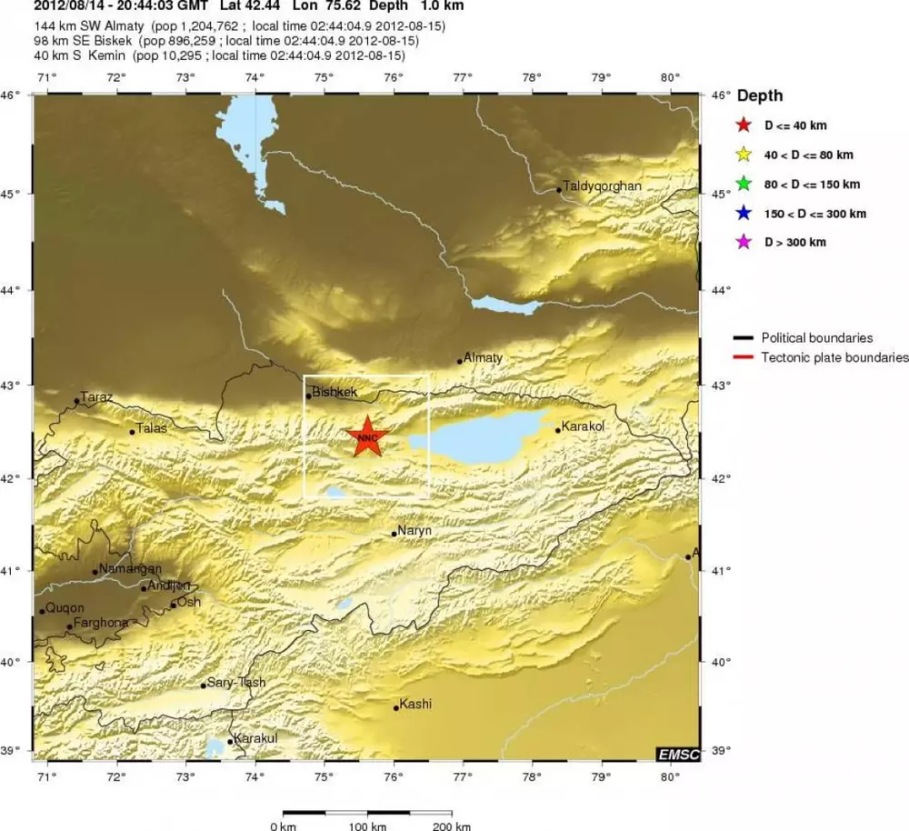 В 144 километрах от Алматы произошло землетрясение магнитудой 3,2, передает корреспондент Tengrinews.kz со ссылкой на Европейско-Средиземноморский сейсмологический центр. Подземные толчки были зафиксированы 15 августа в 02.44 по времени Астаны. Эпицентр землетрясения, глубина которого составила один километр, находился на территории Кыргызстана в 98 километрах от Бишкека. Сведений о жертвах и разрушениях нет. Напомним, 13 августа на территории Китая произошло землетрясение магнитудой 4,1. Эпицентр подземных толчков находился на глубине одного километра в 323 километрах к югу от Алматы.