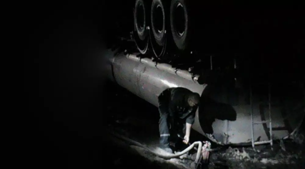"На равнинной местности произошло опрокидывание грузовой автомашины марки КамАЗ, гос/ном: Х 430 СА автоцистерны емкостью 30 тонн серной кислоты под управлением водителя Т.С. Анадурдаева, 1955 года рождения, ТОО "Саяттраснсервис". В результате опрокидывания произошел разлив серной кислоты из автоцистерны в количестве 1,5 тонны", - говорится в сообщении ДЧС.