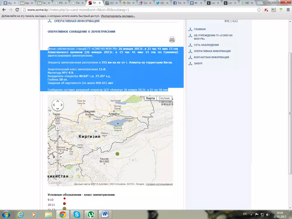 По ее данным, землетрясение было зарегистрировано 26 января в 21.41 по алматинскому времени. Эпицентр был расположен в 355 километрах к югу от Алматы на глубине 10 километров. Энергетический класс землетрясения - 11.0.