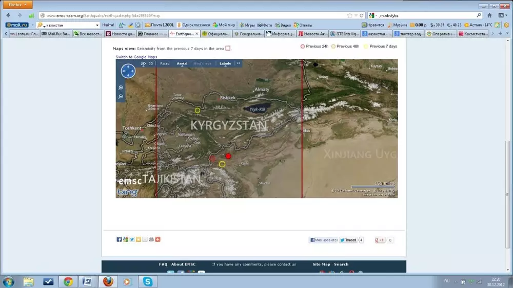 На территории Китая 30 декабря в 21.30 по времени Астаны произошло землетрясение магнитудой 4,1, передает корреспондент Tengrinews.kz со ссылкой на Европейско-Средиземноморский сейсмологический центр. Эпицентр подземных толчков располагался на глубине одного километра в 405 километрах к югу от Алматы, в 149 километрах к югу от города Ат-Баши (Кыргызстан) и в 77 километрах к северо-западу от города Каши (Китай). Информации о жертвах и разрушениях нет.