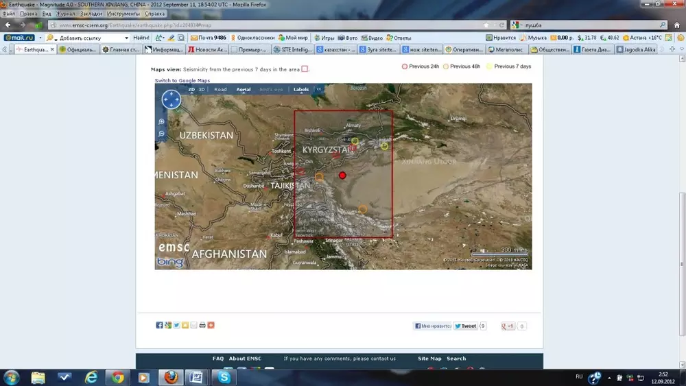 Подземные толчки зафиксированы 12 сентября в 00.54 по времени Астаны. Эпицентр располагался на глубине одного километра в 418 километрах к югу от Алматы, в 134 километрах к северо-западу от города Шаче (Китай) и в 68 километрах к востоку от Каши (Китай). Информации о жертвах и разрушениях нет. С какой силой землетрясение ощущалось на территории Казахстана, пока неизвестно.