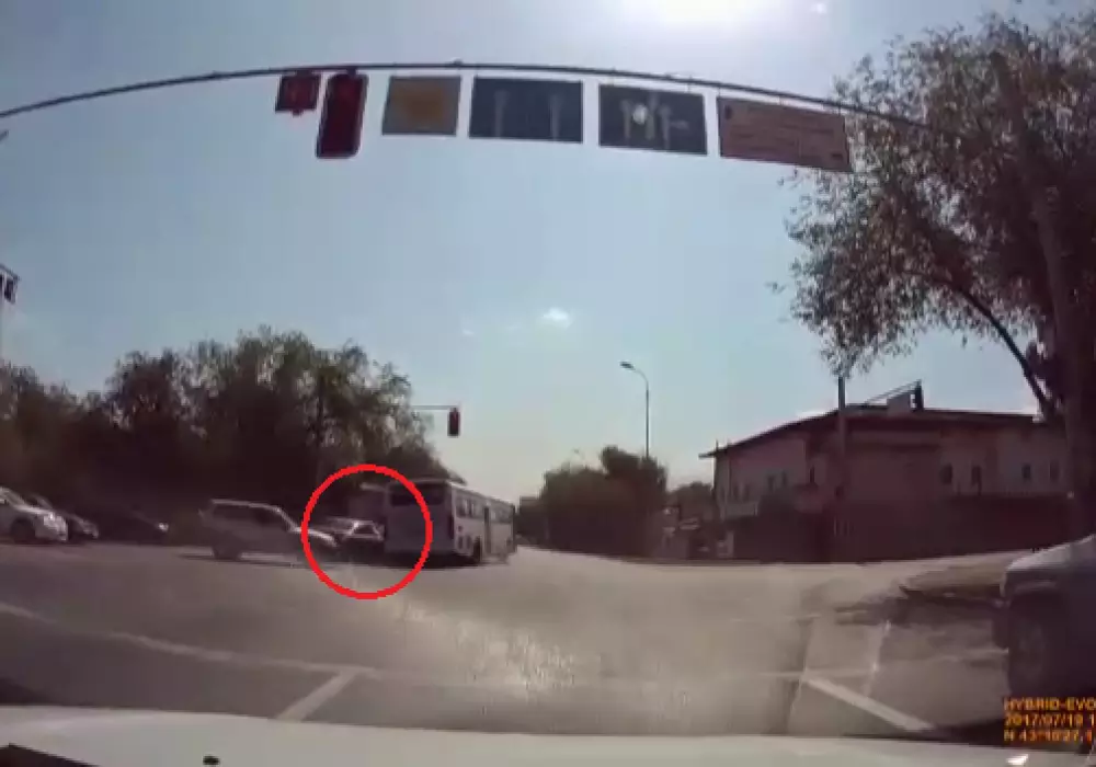 Момент ДТП на пересечении улицы Тургут Озала и проспекта Райымбека заснял видеорегистратор одного из участников дорожного движения.