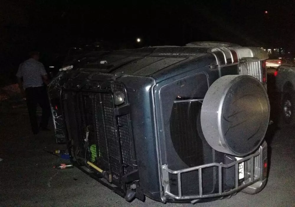 В результате столкновения автомобиль марки Mitsubishi Pajero пролетел 15 метров и опрокинулся на бок. У машины оторвало переднее колесо. К счастью, в результате ДТП никто не пострадал.
