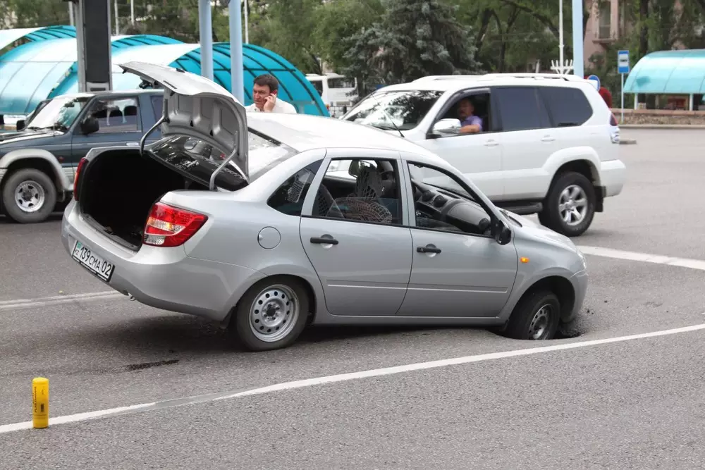 ДТП произошло на пересечении проспектов Достык и Абая. Как рассказал водитель поврежденного автомобиля Lada Granta Карим Касенов, он двигался вниз по проспекту Достык и собирался повернуть налево на проспект Абая, когда правое колесо машины провалилось под асфальт в яму, образовавшуюся в результате подземных пустот.