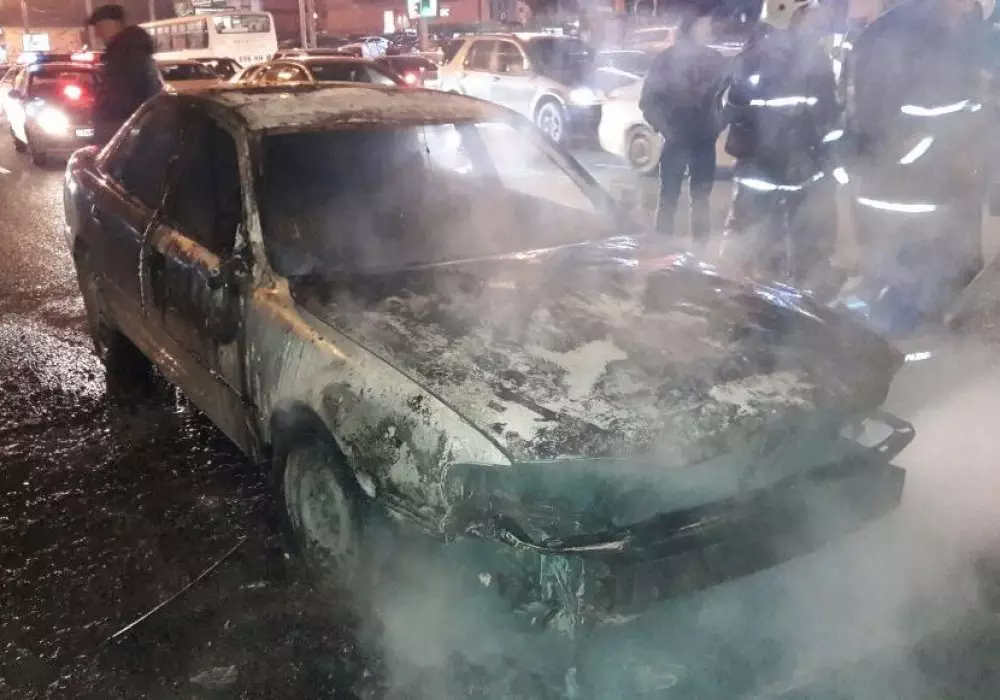 Автомобиль сгорел дотла в одном из оживленных районов Алматы, сообщает корреспондент программы "Территория происшествий" на канале СТВ.