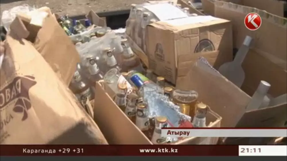 Бульдозер раздавил три тысячи бутылок элитного алкоголя в Атырау Кадр телеканала КТК