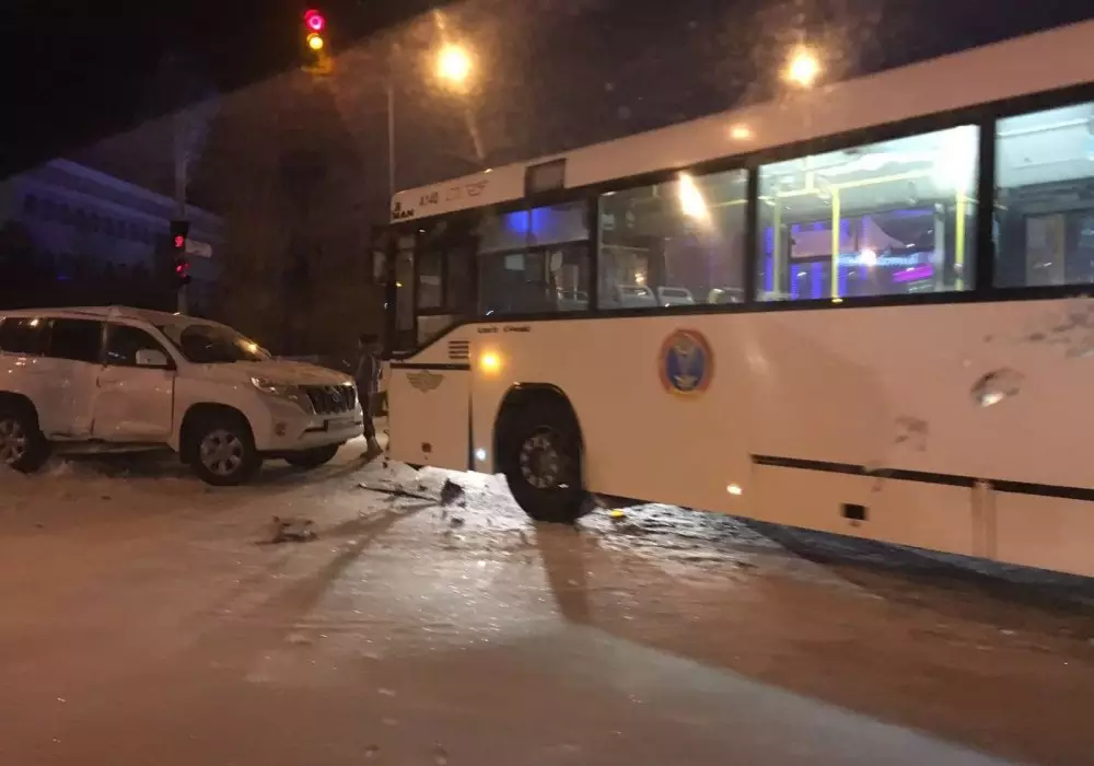 "17 января в 20.54 водитель автомобиля Toyota Land Cruiser Prado, следуя по улице Туркестан в сторону улицы Сарайшык, на пересечении с улицей Кунаева проехал на запрещающий сигнал светофора и допустил столкновение с автобусом марки MAN 29-го маршрута", - пояснили в полиции.