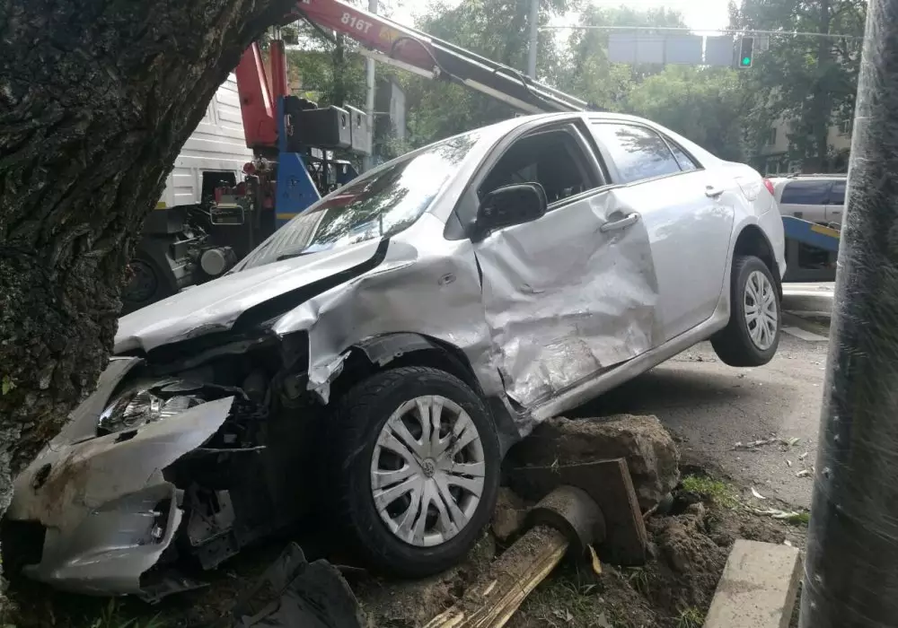 Со слов очевидцев, следуя по улице Курмангазы, Toyota на зеленый свет начала пересекать Желтоксан. В этот момент ей в бок врезался Nissan, который ехал вниз по односторонней улице. Toyota закрутило и отбросило на светофорный столб.