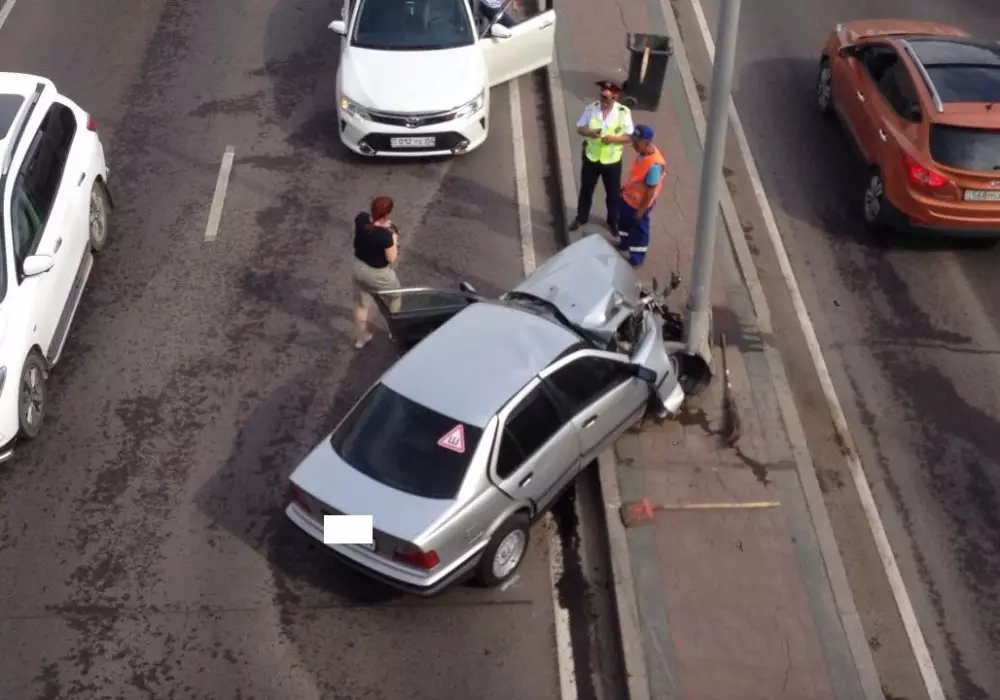 В микрорайоне Самал автомобиль марки BMW серебристого цвета врезался в столб. Передняя часть авто оказалась серьезно повреждена.