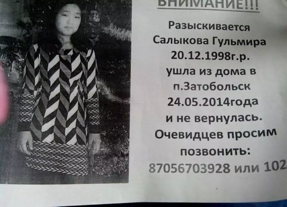 В социальной сети "Одноклассники" пользователи распространяют следующее объявление: "Костанай! Затобольск! Внимание! Ушла из дома 24.05.2014 года и не вернулась жительница поселка Затобольск Салыкова Гульмира, 20.12.1998 г.р. Рост 160 см, длинные темные волосы, казашка. Была одета в черную кожаную куртку с капюшоном, в черные джинсовые брюки, зеленые кроссовки. С ней была черная кожаная сумка. Очевидцев просим позвонить по телефону 87056703928 - мама, либо на 102".