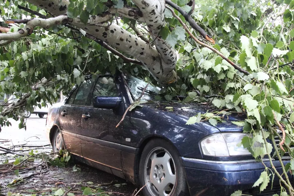 ФОТО: В Алматы упавшее дерево придавило 2 автомобиля с людьми