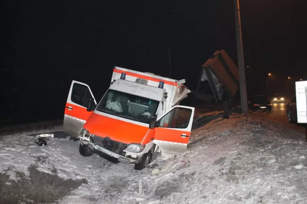 ФОТО: В Алматы автомобиль скорой помощи снес рекламный щит Фото с сайта life24.kz