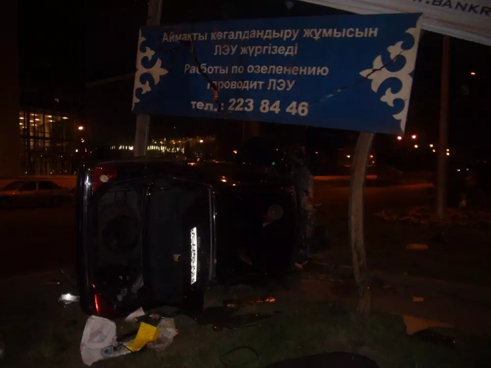 Водитель Mercedes двигался по проспекту аль-Фараби в западном направлении. Как пояснил водитель, его ослепил встречный автомобиль и он не справился с управлением. Автомашина вылетела на разделительный газон и врезалась в рекламный щит. В ДТП пострадала девушка-пассажир, водитель отделался царапинами.