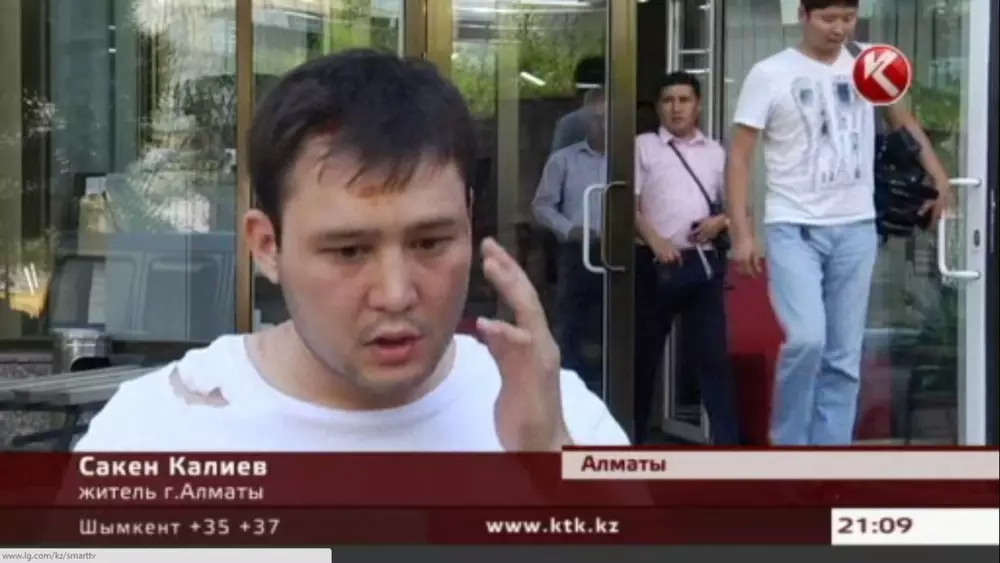 По словам Калиева, он только вернулся от врача. В больнице у него диагностировали ушиб головного мозга, множественные ссадины и назначили лечение. "Я не успел увернуться. Вот сюда задел. Он так чирком ударил, я упал на диван. Забежал еще один помощник, он еще один раз ударил меня. Вот тут шишка с кровью", - сообщил журналистам житель Алматы.