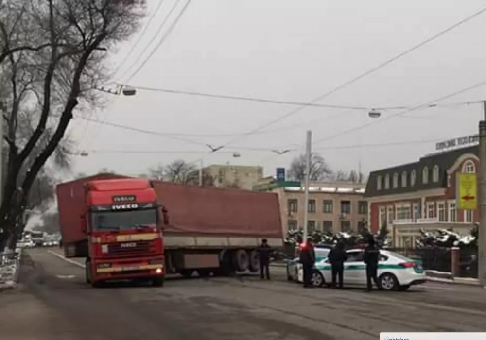По неясной пока причине грузовик с прицепом встал поперек дороги в районе пересечения с улицей Шарипова, тем самым полностью парализовав движение. Полиция закрыла проезд в обе стороны.