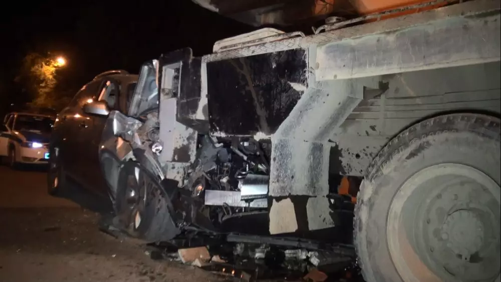 Водитель Infiniti, двигаясь по улице Брусиловского в южном направлении, допустил столкновение с автокраном, припаркованным между улицей Толе би и проспектом Райымбека. В этом районе ведется стройка, у дороги припарковано множество спецтехники. Infiniti также снес указательный знак.