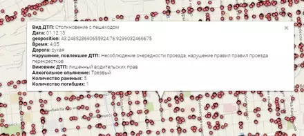 В частности, на карту попало знаменитое ДТП в Алматы, в ходе которого Максат Усенов на своем BMW X6 сбил шесть человек. Датированная 1 декабря 2013 года авария озаглавлена как "Столкновение с пешеходом". Отмечается, что дорога была сухой. В качестве нарушения, повлекшего аварию, указано "Несоблюдение очередности проезда, нарушение правил проезда перекрестков". На карте указано, что виновник был ранее лишен водительских прав. В аварии пострадали пять и погиб один человек. "Я тут нанес на карту все ДТП в Алматы за 2010-2014 годы, по крайней мере, все зафиксированные. Надеюсь, кому-нибудь это может быть интересно, а может, даже полезно", - отмечает автор карты.